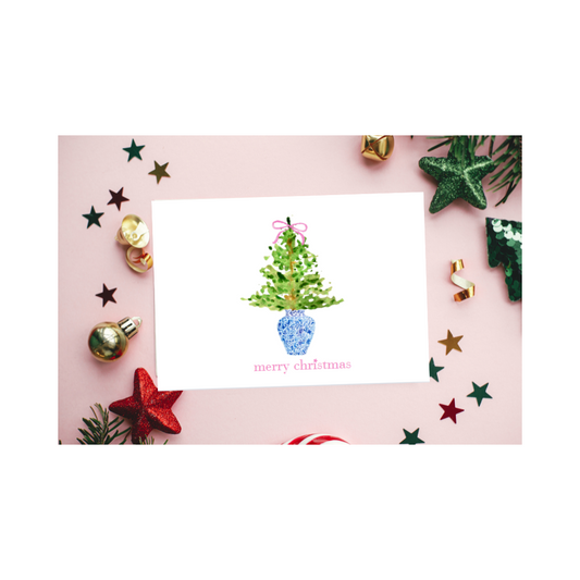 Boxed Greeting Card Set (10) - chinoiserie potted tree in pink, lined envelopes
