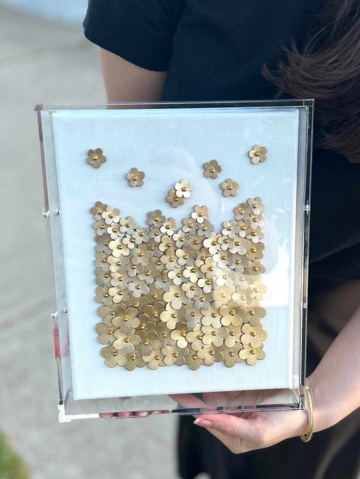 This 8x10x2" work is framed in an acrylic shadowbox and filled with various sizes of gold painted, custom cut leather flowers hand-pinned for a stunning 3D effect. Gold Rush is a unique and engaging piece that would work well with many interior styles. Please contact us for pricing and availability.
